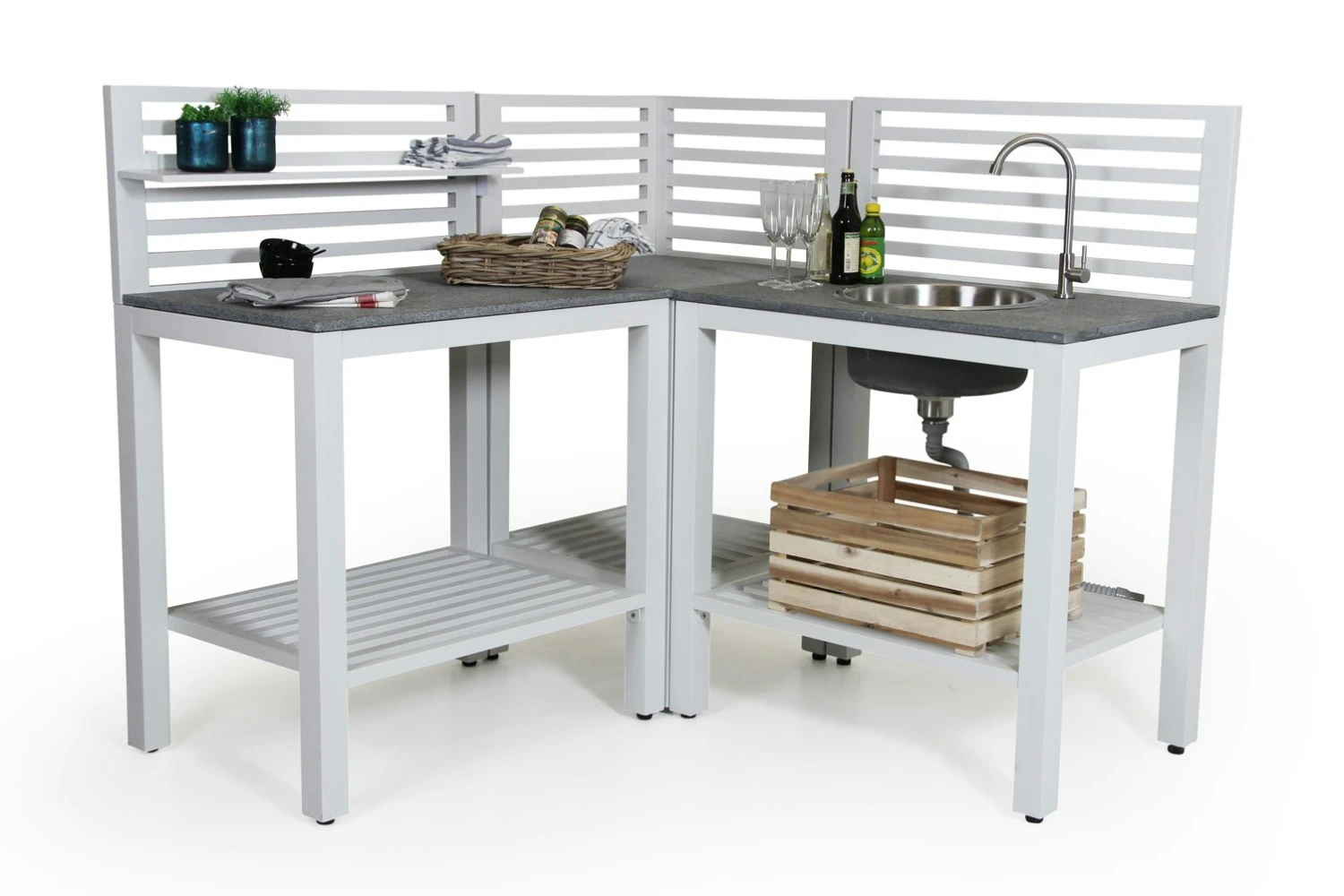 Die Bellac Outdoor-Küchenecke von Brafab ist eine praktische Ergänzung zu deiner Bellac Outdoor-Küche, die es ermöglicht, Speisen im Freien zuzubereiten. Sie hat einen Korpus aus pulverbeschichtetem Aluminium, der keine Wartung erfordert. Die Arbeitsplatte besteht aus Granit und darunter befindet sich ein praktisches Regal zur Ablage von Zubehör. Es stehen zwei Farben sowie verschiedene Modelle zur Auswahl, die du für eine größere Küche miteinander kombinieren kannst.
