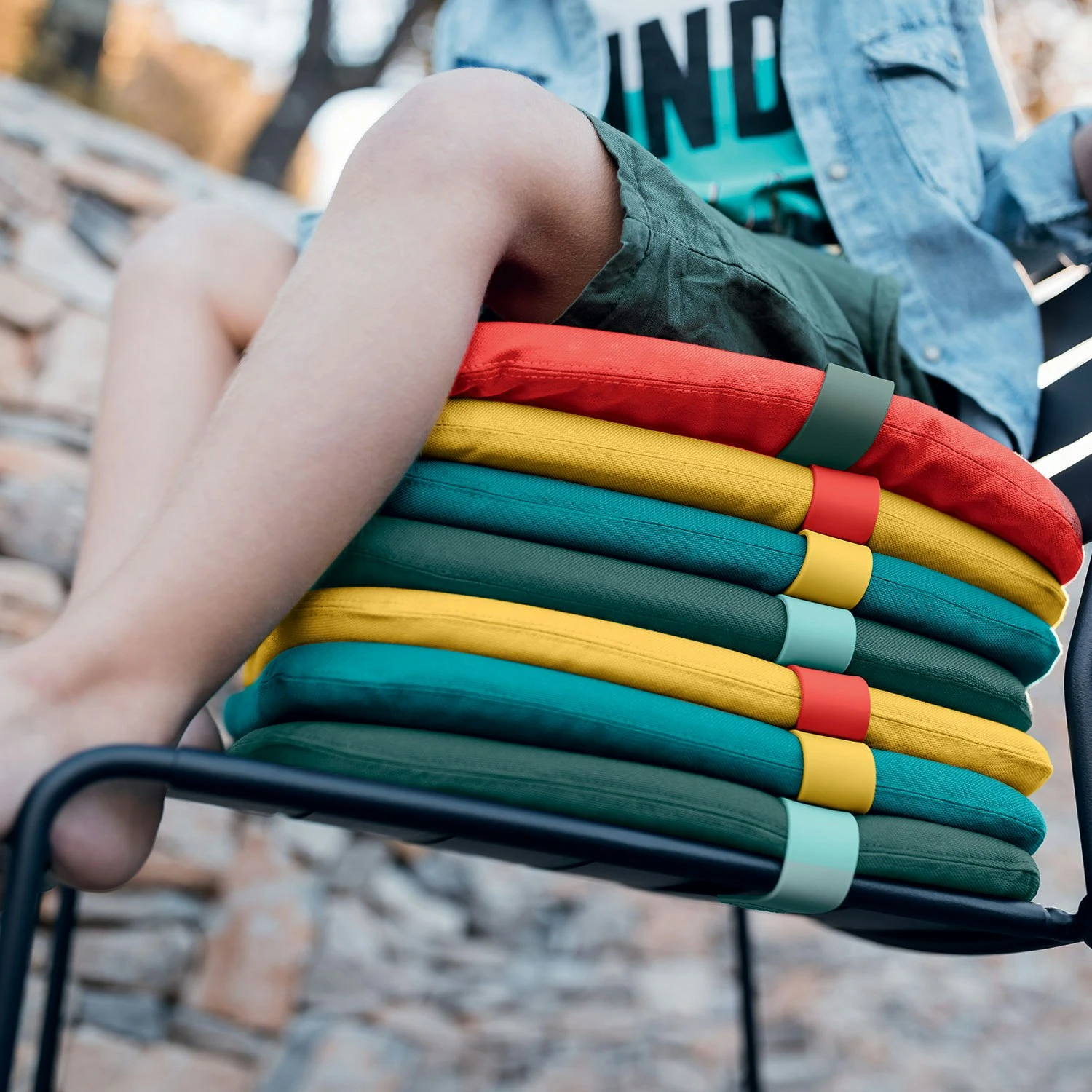 Color Mix Sitzkissen von Fermob. Ein einfaches, aber dekoratives Kissen, das deinen Gartenmöbeln einen kontrastierenden Farbklick verleiht. Die kleine Schnalle verleiht dem Kissen ein zusätzliches Detail und hat auch eine praktische Funktion, da sie das Kissen auf dem Stuhl an Ort und Stelle hält. Das Material ist vom Typ Darlon, das zu 100% aus Outdoor-Acryl besteht, welches beständig gegen Flecken, Schimmel, Verschleiß und Sonnenlicht ist.