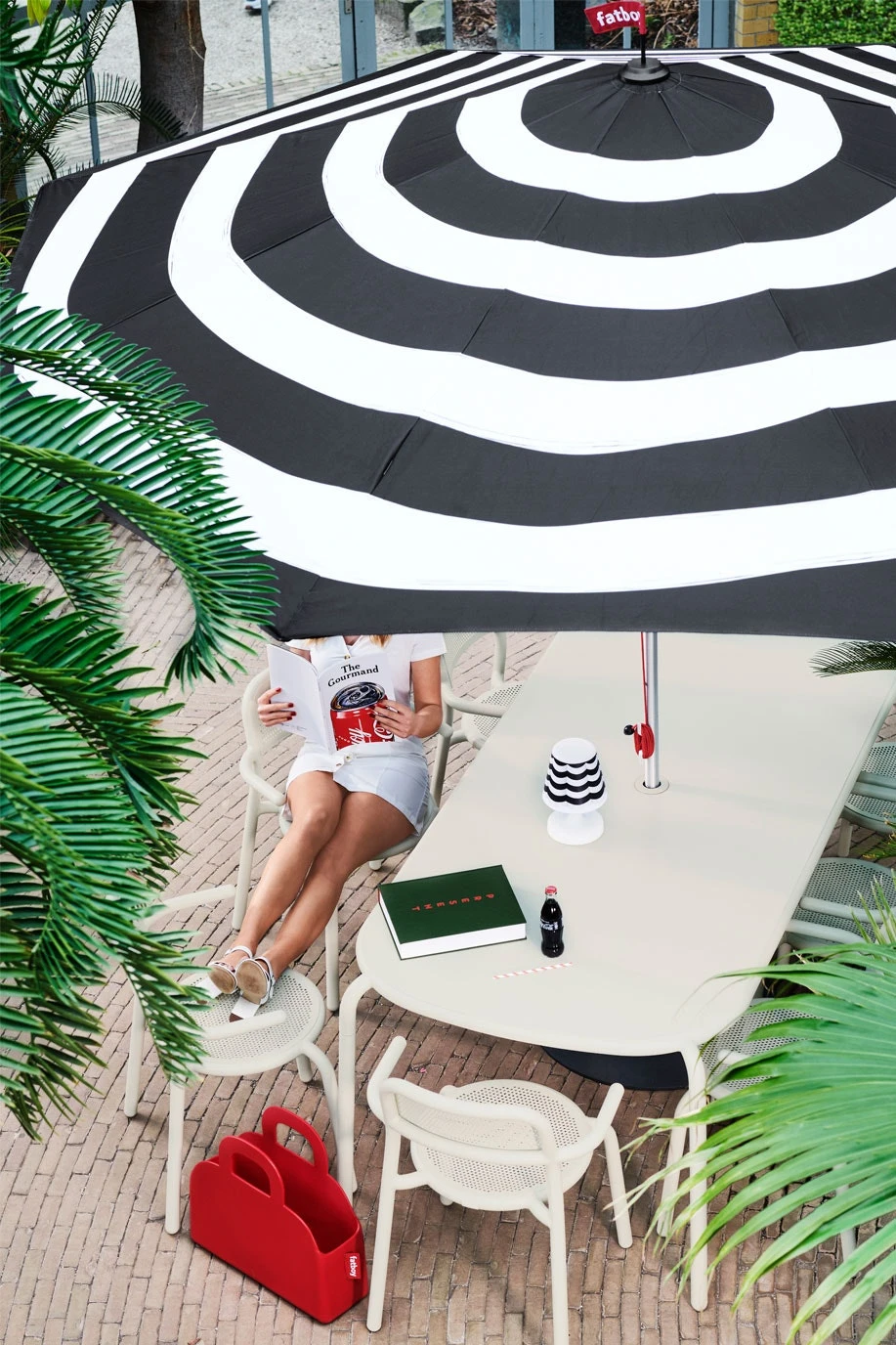 - The table top has a hole which can be used for a parasol during the day and at night used as a candle holder